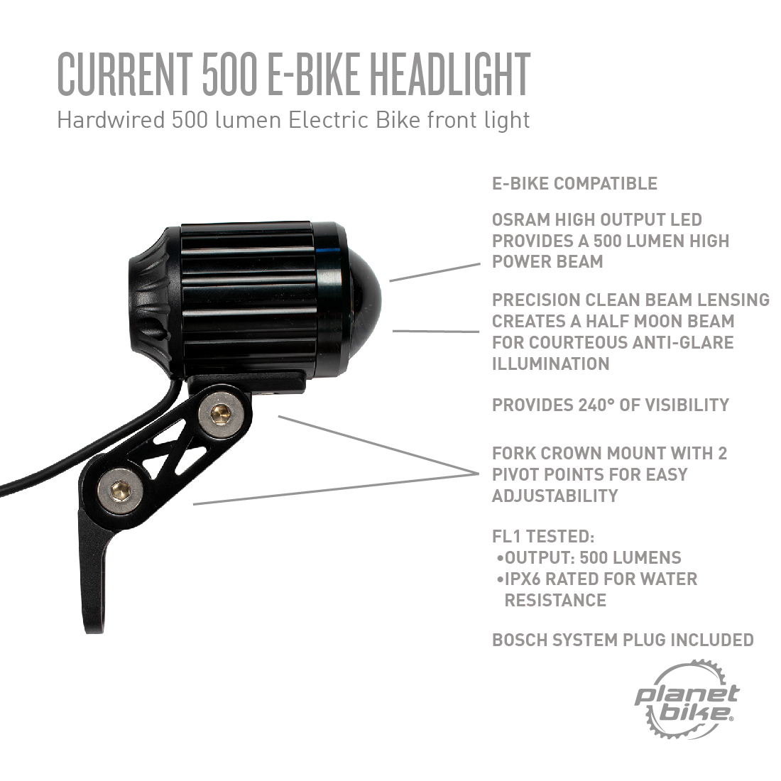 Great optics, abundant lumen output and clean design make Planet Bike's Current 500 a smart choice for E-bike cyclists. Be safer and brighter on the path without blinding your fellow riders!