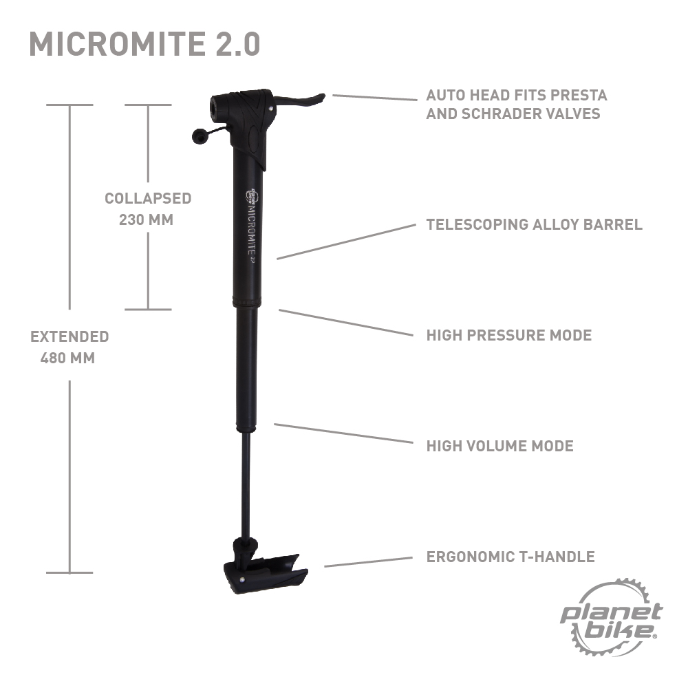 Planet Bike's Micromite 2.0 is compact, rugged and lightweight. The autohead and telescoping dual stage barrel make quick work of road side repairs.