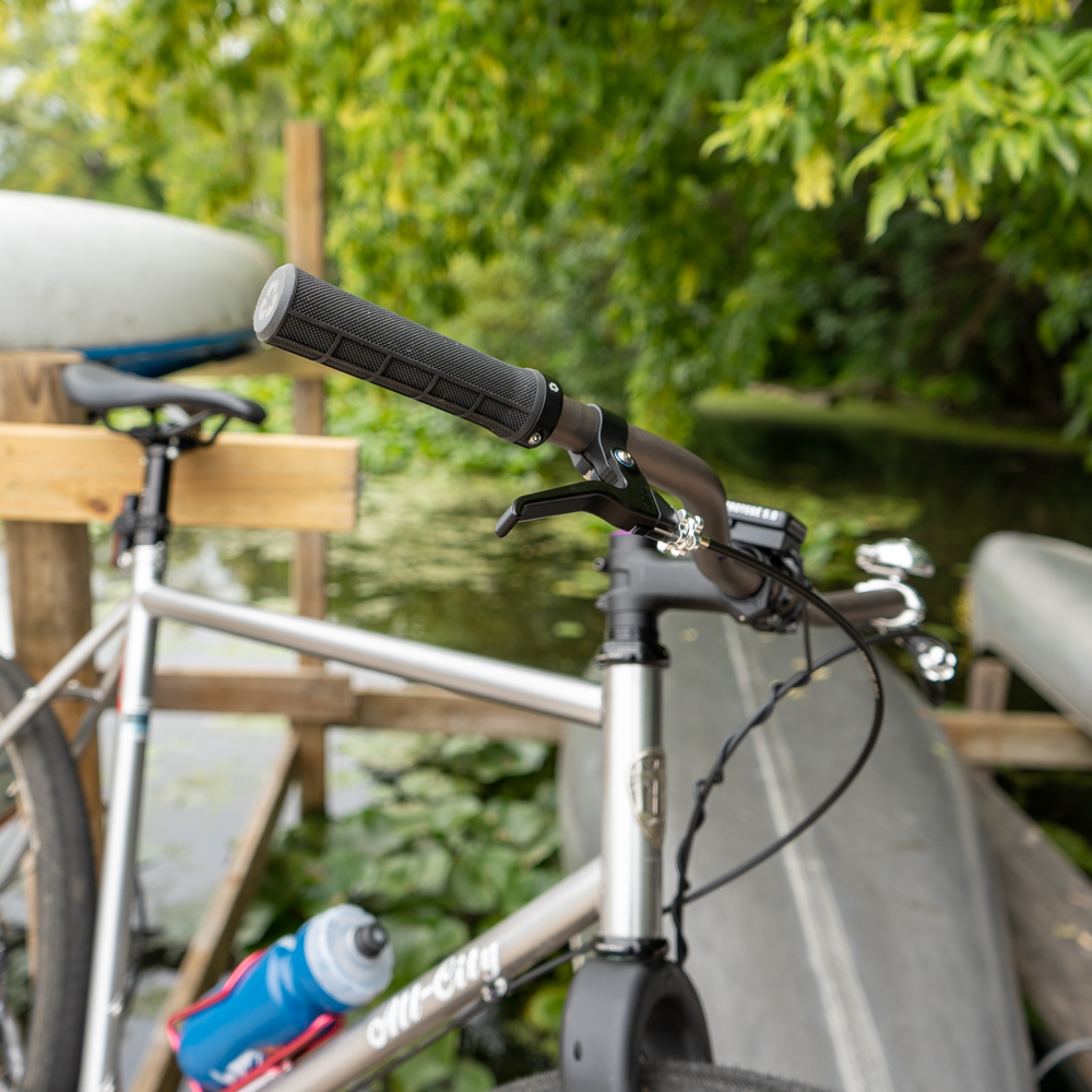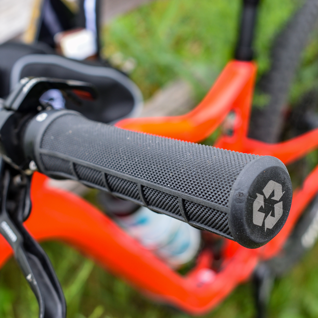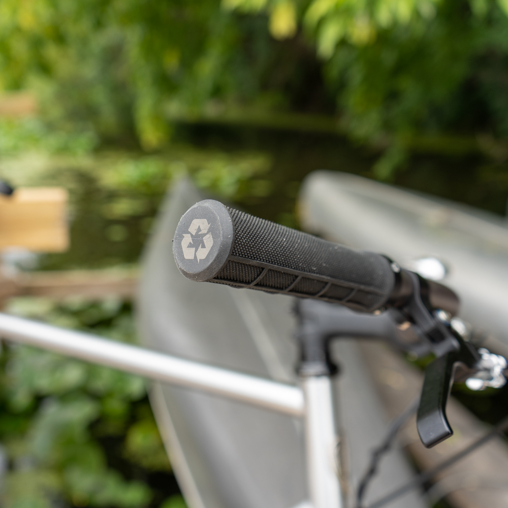 The Recycled Joe uses post consumer recycled plastic to create the core for this member of the Planet Bike’s Happy Hands family of grips. There is no sacrifice to the non-slip synthetic rubber construction and tacky diamond cut pattern that absorb vibration and deliver the perfect balance between comfort and control. Like the original model, the underside of the grip features raised grooves that engage with your finger tips to create a positive point of contact between you and your bike. Whether you pedal a mountain bike, commuter, beach cruiser, fixie, bmx or e-bike, slide the Recycled Joes on your bars and enter a world of all day comfort and control and help save the planet!