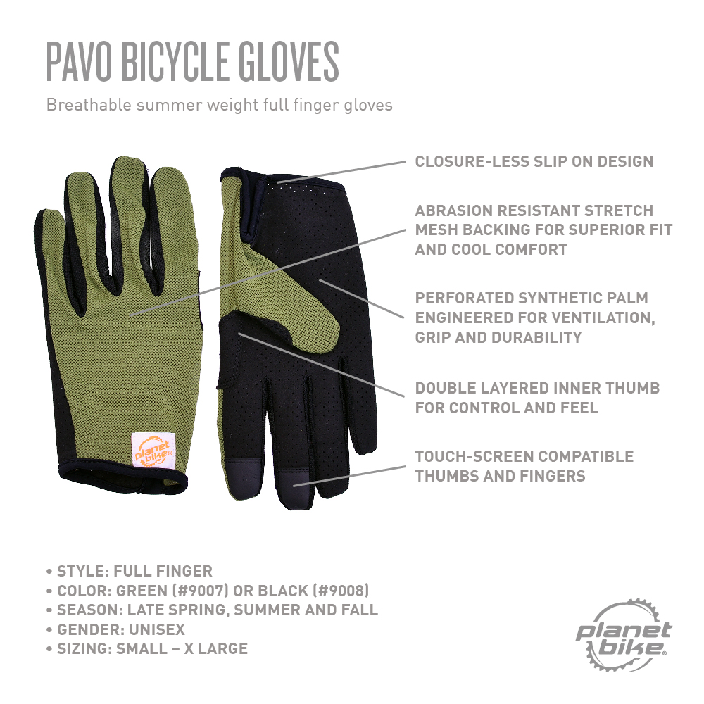 We built the Pavo full finger cycling glove to meet the challenge of an IMBA EPIC ride. It’s technically designed with all the features you need for long summer days on your bike. The back of the hand is covered with close-fitting perforated 4-way stretch mesh fabric to provide great breathability to keep your hands sweat free and cool. The slim and durable synthetic palm is perforated for additional ventilation and the re-enforced inner thumb keep you in close contact with your bars for great feedback and control. Touch-screen compatible pads on the thumb, middle and index fingers let you access your smartphone without de-gloving. The clean style and closure-less slip-on design make these the ideal glove for all your epic summer adventures whether you’re tackling the Monarch Crest trail or bicycling on your local terrain.