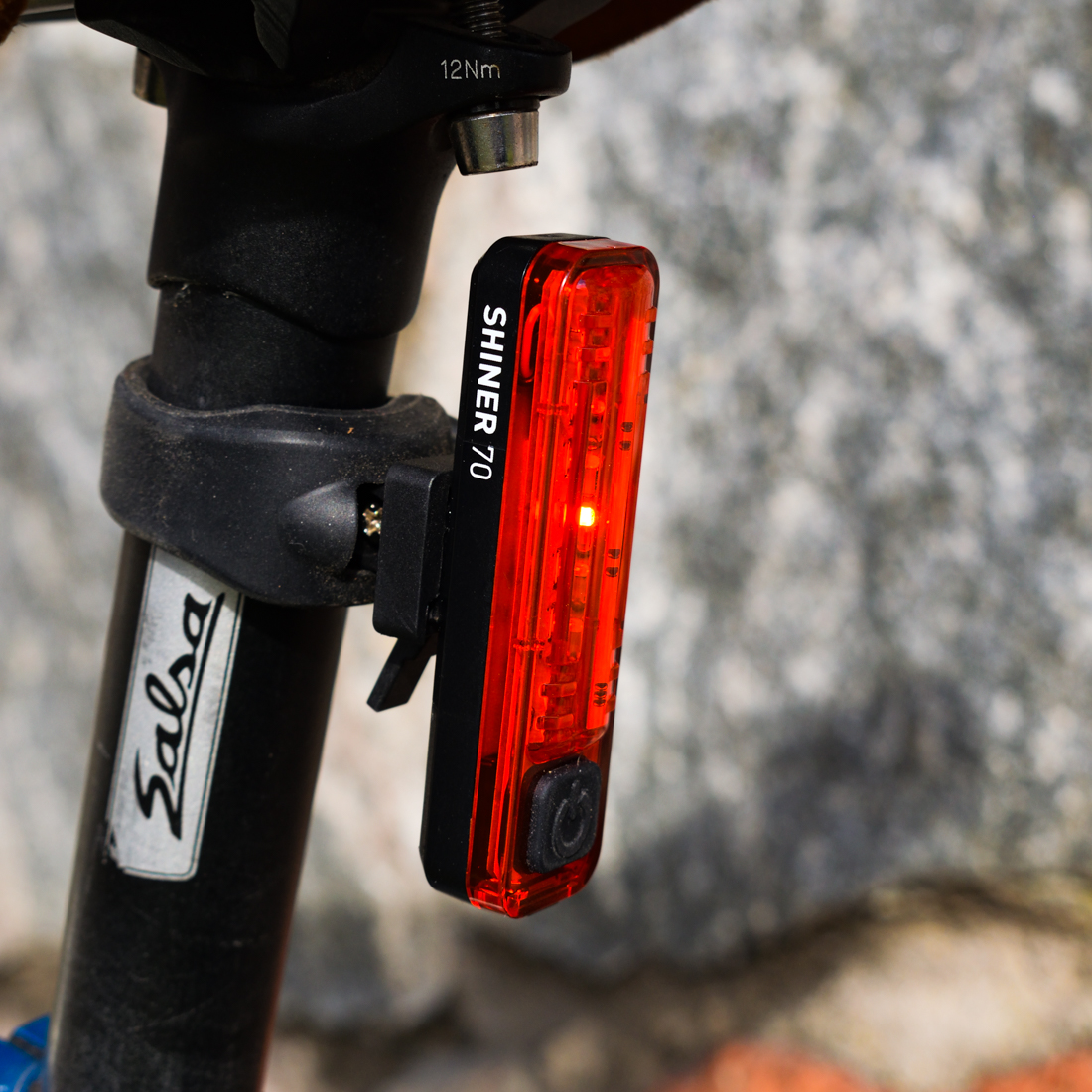The Shiner 70 bike light set is a unique and high visibility front and rear combo set that will make you more visible to other cyclists and drivers while out on your ride. Its modern linear design integrates smoothly to your bike. Not only does it look sharp, but the head light and tail light deliver 70 lumens of broad beam light to make sure you're safe and seen in traffic whether it's day or night. The USB C rechargeable 440 mAh lithium polymer battery is fast charging and will keep the Shiner 70 lights powered up for up to 12 hours. The versatility of the rubberized Quick Strap mounting system lets you attach the lights to your head tube, down tube, fork, handlebars, seat post, or rear rack. Our waterproof design, soft touch button, and simple mounting make this the go to light set for every type of bike including cargo bikes, electric bikes, and gravel bikes. Add the Shiner 70 bike lights to your bicycle and let it shine, let it shine, let it shine.