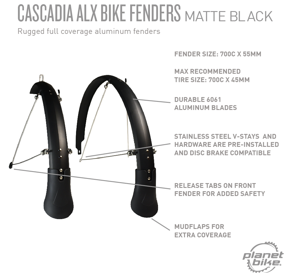 Gravel bikes are built to ride everything and go everywhere. Adventuring can get a little sloppy so fender up that gravel stallion. Planet Bike’s 700c x 55mm Cascadia ALX fenders are designed to fit a gravel bike’s wider tires (recommended for up to 45mm tires). With all stainless hardware and long mudflaps, both you and your bike will be protected from the elements. If your bike exploits include commuting, long weekend rides, bikepacking trips or gravel grinding, upgrade your fender game with this set of sturdy and beautiful aluminum fenders.
