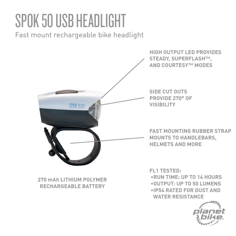 Let the Spok 50 USB headlight lead the way. Its mission: to help you explore new paths and boldly go by bicycle. This versatile little light uses a rechargeable lithium polymer battery to deliver three safety light modes, long run times and 270° of visibility. Now with USB C charging. The light easily secures to a helmet or handlebars to light your way. Stay seen! Stay safe!