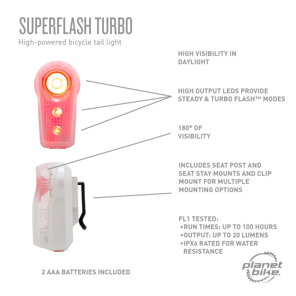 The Superflash Turbo tail light was built to keep you visible on all your bicycling adventures. With a focused lens for intense lumen output and the same simple form factor of the Superflash, the Turbo's 20 lumens make you visible both day and night. The legendary, attention-grabbing flash pattern with up to 100 hours of run time make this the go to light for many cyclists.